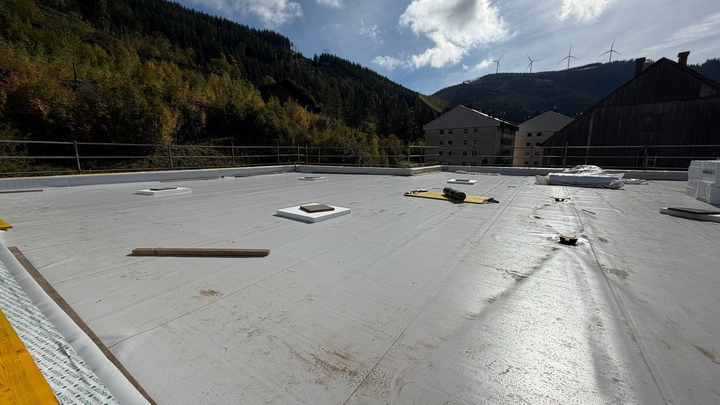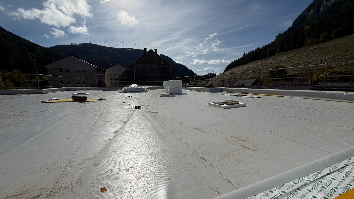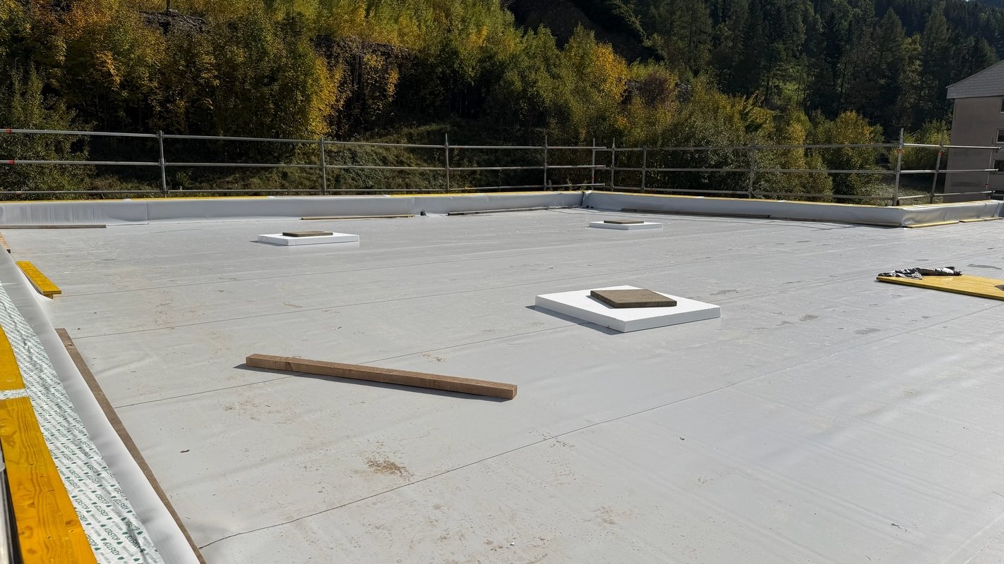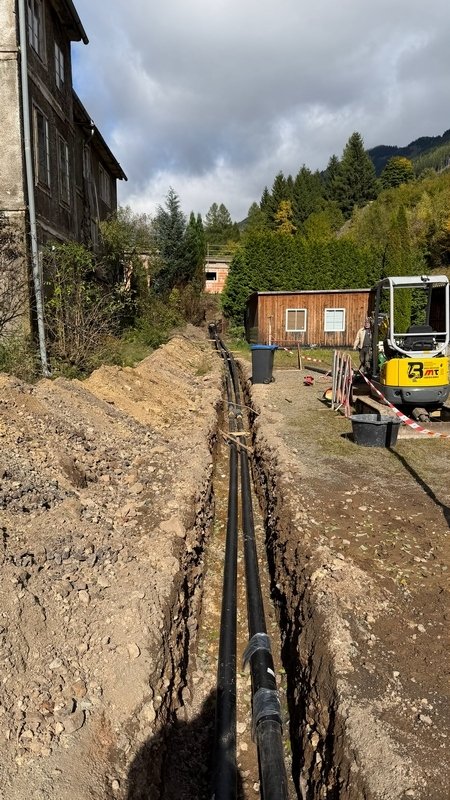Beide Dachflächen stehen kurz vor der Fertigstellung. Die Verlegung der Fernwärmezuleitung ist auch erfolgt.