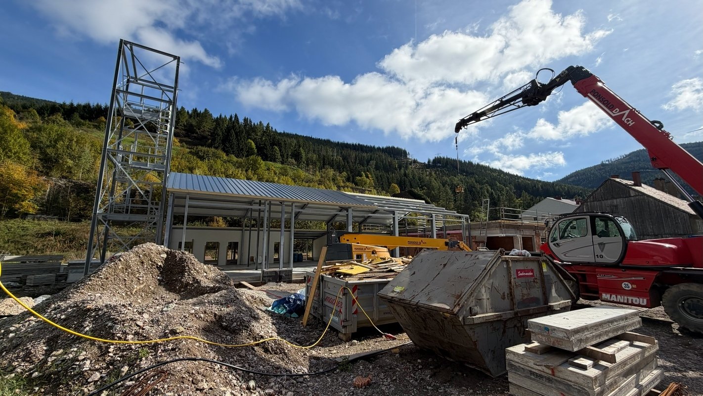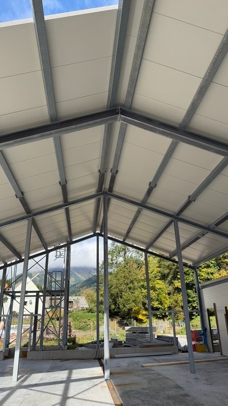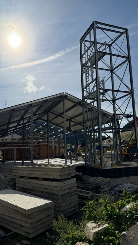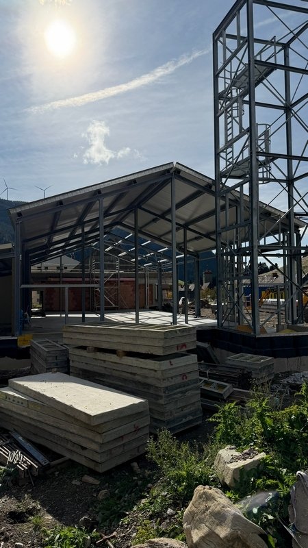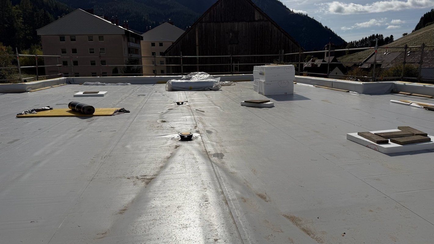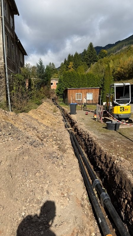 Beide Dachflächen stehen kurz vor der Fertigstellung. Die Verlegung der Fernwärmezuleitung ist auch erfolgt.